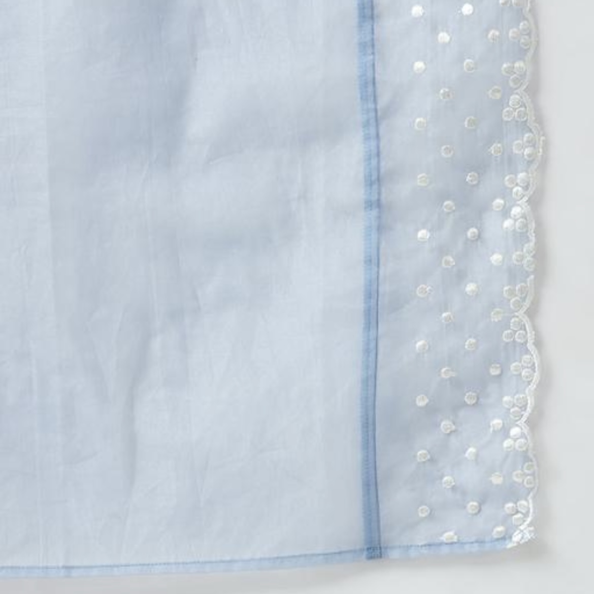 The set also includes a lightweight organza dupatta with beautiful embroidery. The embroidered detail adds a festive and elegant touch to the outfit.