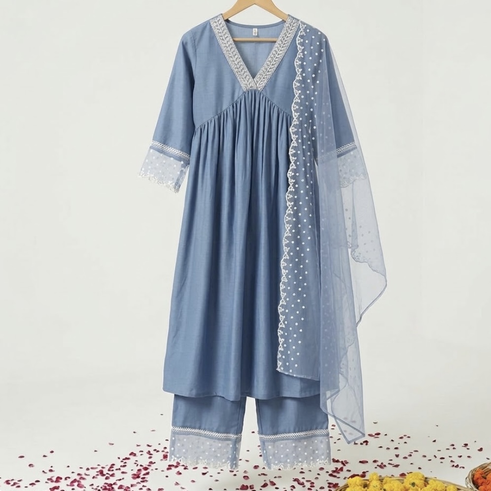 Add elegance and traditional style to your wardrobe with this Blue Silk Blend Kurta Palazzo Set with Embroidered Dupatta. This beautiful ethnic outfit is perfect for festive occasions, parties, and family gatherings.