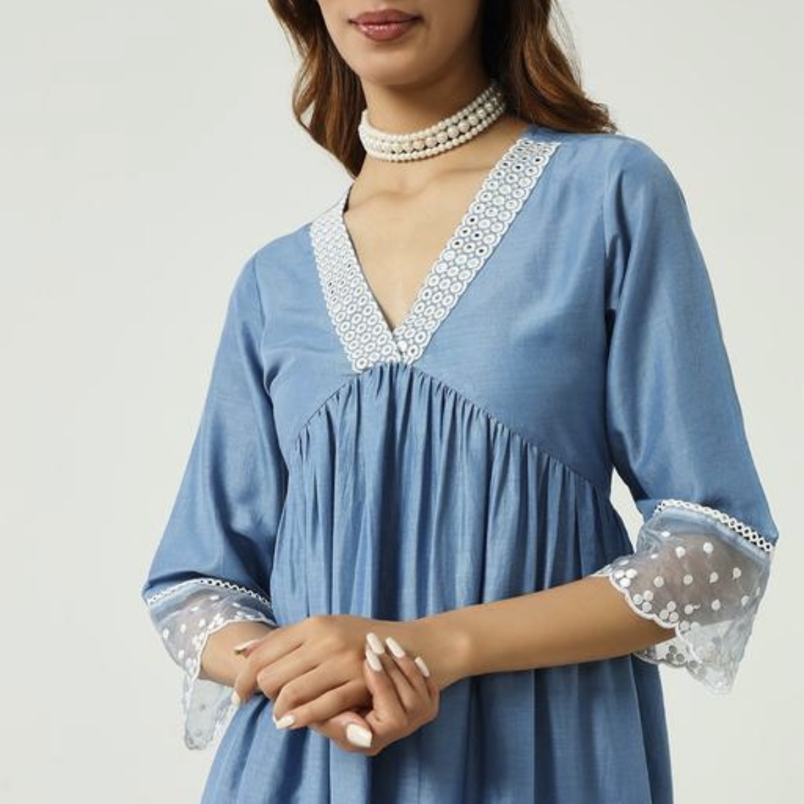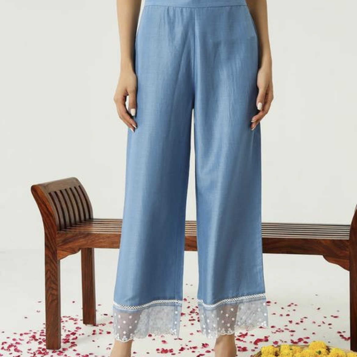 The outfit comes with blue palazzo pants, which are comfortable and easy to move in. The wide-leg design gives the outfit a graceful and stylish look.